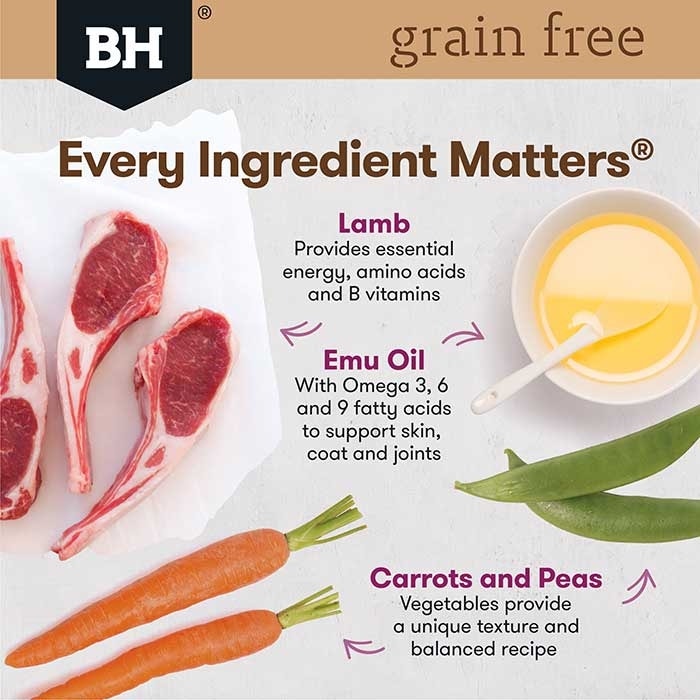 Lamb, Chicken, Natural Gums, Vitamins and Minerals, Prebiotics, Emu Oil