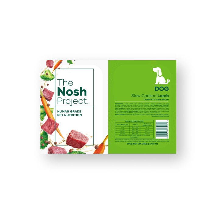 The Nosh Project Slow Cooked Lamb is a single animal protein meal packed with human grade, fresh Aussie ingredients and is suitable for adult & senior dogs.