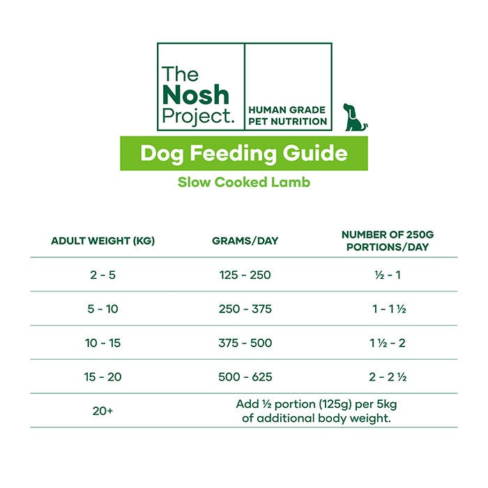 | Advice Care | If feeding The Nosh Project for the first time, gradually transition to this new food over a period of 5 to 7 days. Please refer to website for full feeding instructions. The feeding amounts should be seen as a guide only. Your pet may need more or less depending on your dog’s size, age, breed and activity level. |