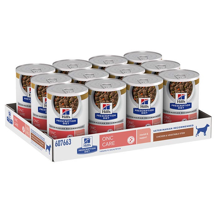 Hill’s Prescription Diet ONC Care Chicken & Vegetable Stew Dog Food is clinical nutrition designed to nourish and support dogs living with serious illness such as cancer. It’s made in the USA with global ingredients you can trust, and was developed by Hill’s nutritionists and veterinarians. This food has an irresistible taste to encourage eating from the very first bowl. It is also formulated with highly digestible protein to help maintain strength and energy as well as ActivBiome+ technology to nourish your dog’s gut microbiome. Please consult your veterinarian for further information on how Prescription Diet foods can help your dog continue to enjoy a happy and active life.