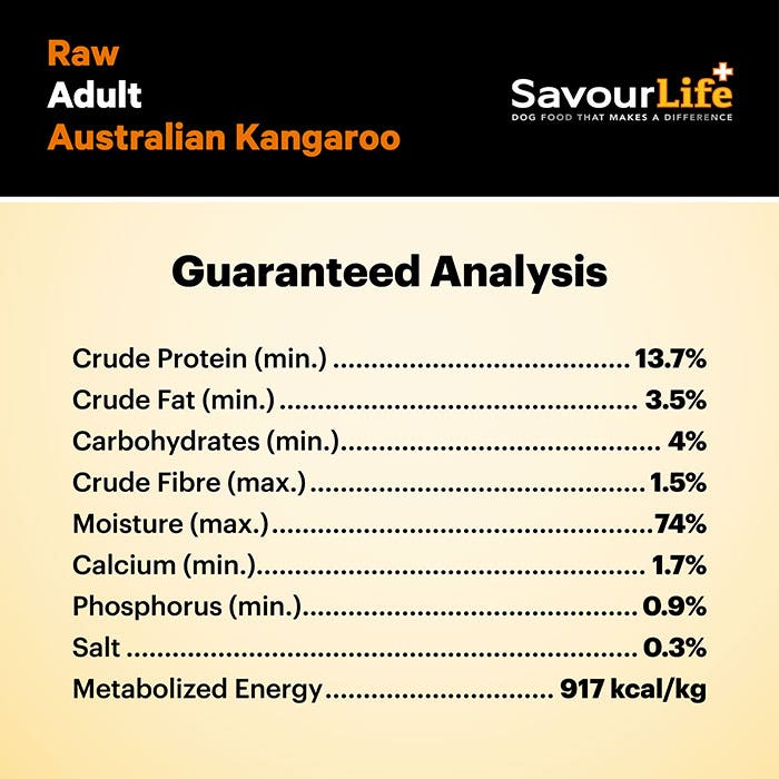 SavourLife’s All Natural Raw Frozen food consists primarily of raw meat, a rich source of amino acids which play a key part in many bodily functions like, supporting muscle activity, transporting nutrients and oxygen around the body, building and repairing tissue as well as supporting the immune system. Finely ground kangaroo bone and cartilage provide a natural source of phosphorus and calcium, that is important for many aspects including healthy teeth and bones. Offal including Kangaroo heart , liver and kidneys are a good source of iron, that helps create red blood cells in the body. Fatty acids and taurine which is good for heart health as well as vitamin A an antioxidant that helps with vision, bone health and neurological function as well as other minerals.