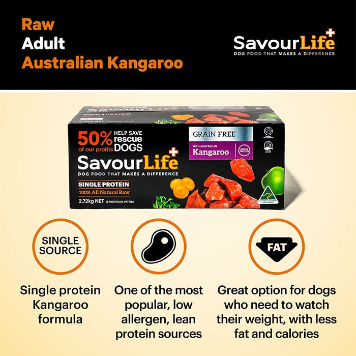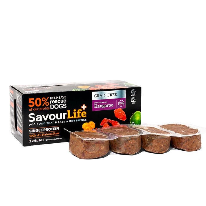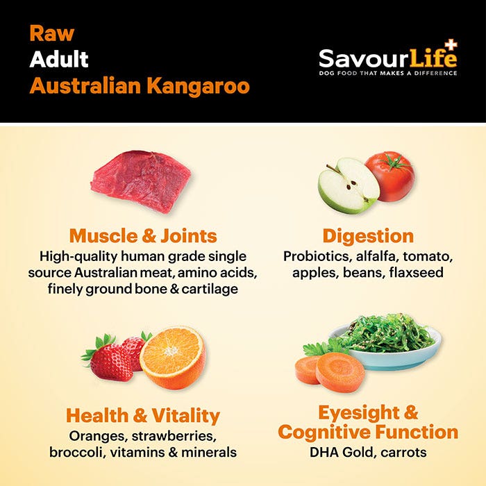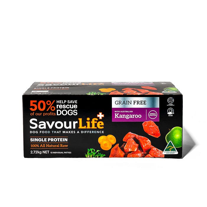 SavourLife’s All Natural Raw Adult Kangaroo, is a Single Protein meal that is filled with the finest, natural, huma-grade Australian ingredients. With superfood inclusions like strawberries, broccoli, tomatoes, carrot, apples, oranges and flaxseeds; plus vitamins, minerals, natural pre-biotics, probiotics and amino acids. Plus, it’s grain free, gluten free and hypoallergenic, and contains no artificial colours, flavours or preservatives.